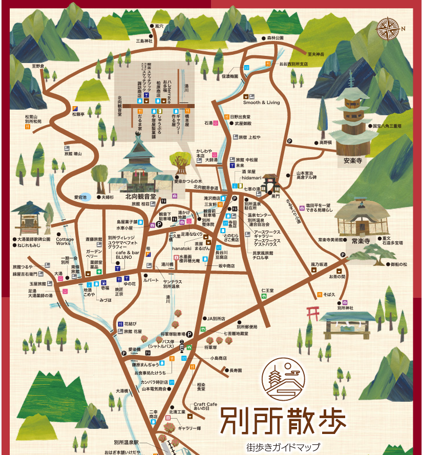 別所温泉に行こうと決めたら、ガイドマップを上記の別所温泉観光協会HPからダウンロードするか、現地で調達して下調べしておきましょう。
